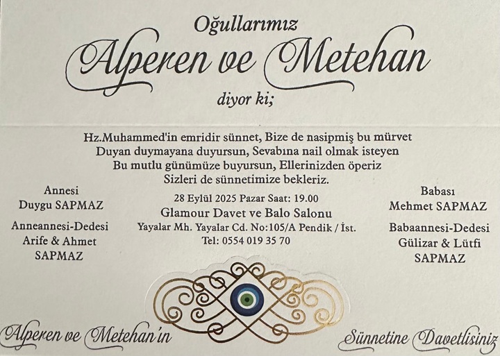 28 Eylül 2025 Pazar günü Saat 19:00 ' da Glamour Davet ve Balo Salonu'nda yapilacak sünnet dügünlerinin ardindan erkeklige ilk adimini atacaktir.