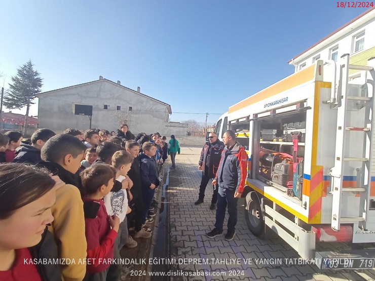 18 Aralik 2024 tarihlinde, Il AFAD Müdürlügü Uzman Ekipleri tarafindan içlerinde Disli Kasabali Özgür SOLMAZ ve Muhammed YILDIRIM kardeslerimizinde bulundugu, Il AFAD Müdürlügü Uzman Ekipleri esliginde, Disli Ilkokulu ve Disli Atatürk Ortaokulu'nda Tüm Ögretmen, Personel ve Ögrencileriyle birlikte Deprem ve Yangin aninda nasil tahliye olacagi, tahliye sirasinda güvenli alanlara yönlendirilme ve olabilecek tehlikelere karsi alinacak önlemler, Yangin Tatbikati Yangin olunca neler yapilmali, yangin tüpünün kullanimi konulari açiklanarak uygulamali söndürme çalismalari yapildi.