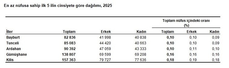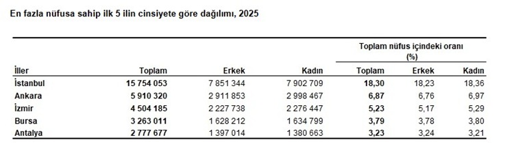 Türkiye’de ikamet eden nüfus 2025 yilinda, bir önceki yila göre 427 224 kisi artti. Erkek nüfusun orani %50,02 (43 059 434 kisi), kadin nüfusun orani ise %49,08 (43 032 734 kisi) olarak gerçeklesti.