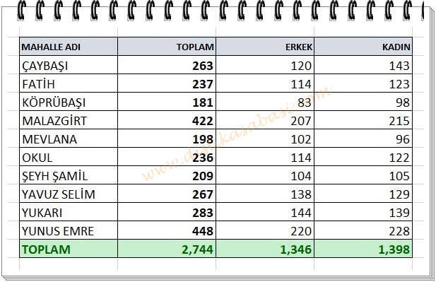 KASABAMIZ 2025 YILI MAHALLE BAZINDA NÜFUS BILGILERI