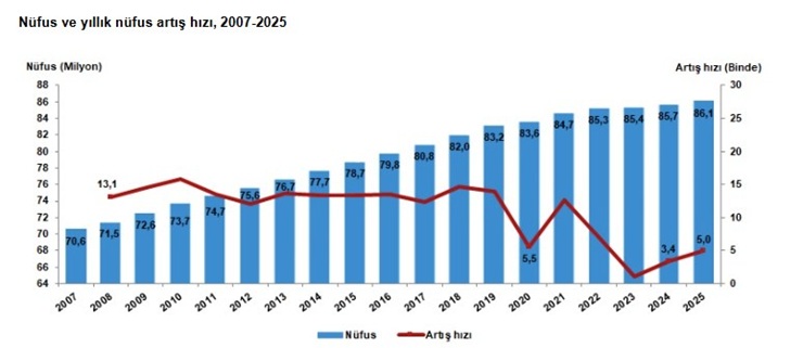 Türkiye Istatistik Kurumu (TÜIK), "Adrese Dayali Nüfus Kayit Sistemi 2024 Nüfus Sayimi Sonuçlari'ni açikladi. Türkiye nüfusu, 2025 sonu itibariyle 86 milyon 92 bin 168 kisiye yükseldi.
