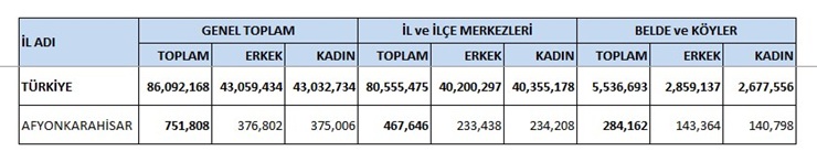 Türkiye’de ikamet eden nüfus 2025 yilinda, bir önceki yila göre 427 224 kisi artti. Erkek nüfusun orani %50,02 (43 059 434 kisi), kadin nüfusun orani ise %49,08 (43 032 734 kisi) olarak gerçeklesti.